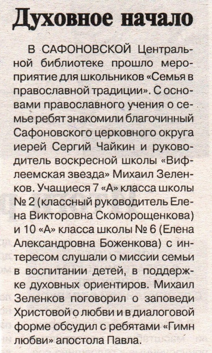 Духовное начало // Сафоновская правда. - 2025. - 6 ноября. - С. 1.