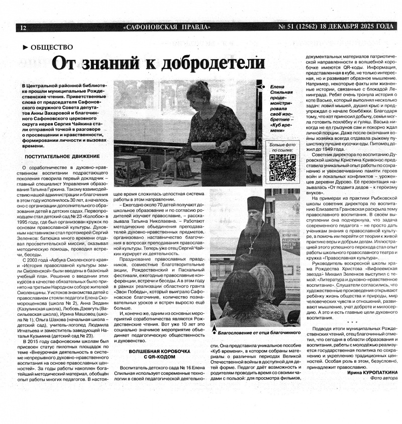Куропаткина, И. От знаний к добродетели // Сафоновская правда. - 2025. - 18 декабря.