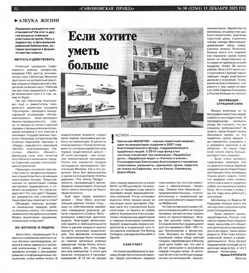 Куропаткина, И. Если хотите уметь больше // Сафоновская правда. - 2025. - 11 декабря.