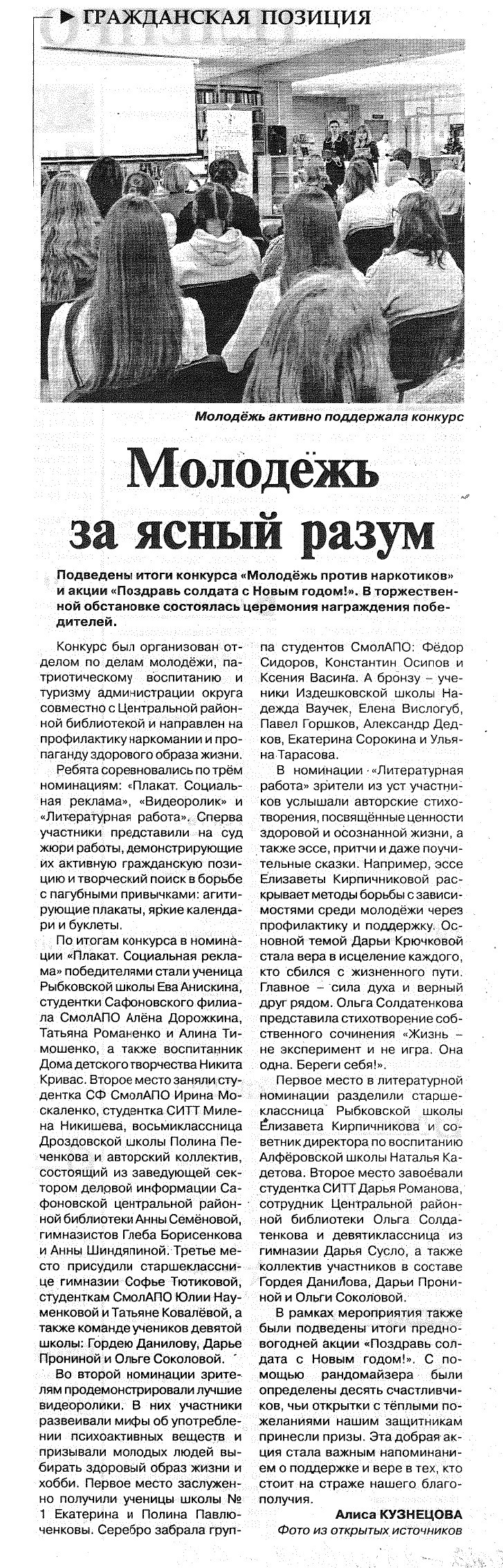 Кузнецова, А. Молодежь за ясный разум // Сафоновская правда. - 2026. - 29 января. - С. 5.