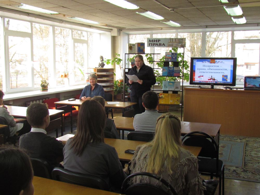 20 ноября – Всемирный день прав ребенка. В этот день в читальном зале районной детской библиотеки в рамках программы по нравственно-правовому воспитанию «Поколение NEXT – нравственные ориентиры» состоялось мероприятие Час правового общения со специалистом «Подросток – права, обязанности, ответственность», цель которого донести до подрастающего поколения информацию о необходимости знать свои права и обязанности, правильно ими пользоваться. На встрече присутствовали учащиеся 6 «А» класса МБОУ гимназия, педагог- психолог Лапина Елена Дмитриевна, социальный педагог Орлова Елена Геннадьевна и инспектор по делам несовершеннолетних лейтенант полиции Гракова Ольга Сергеевна.