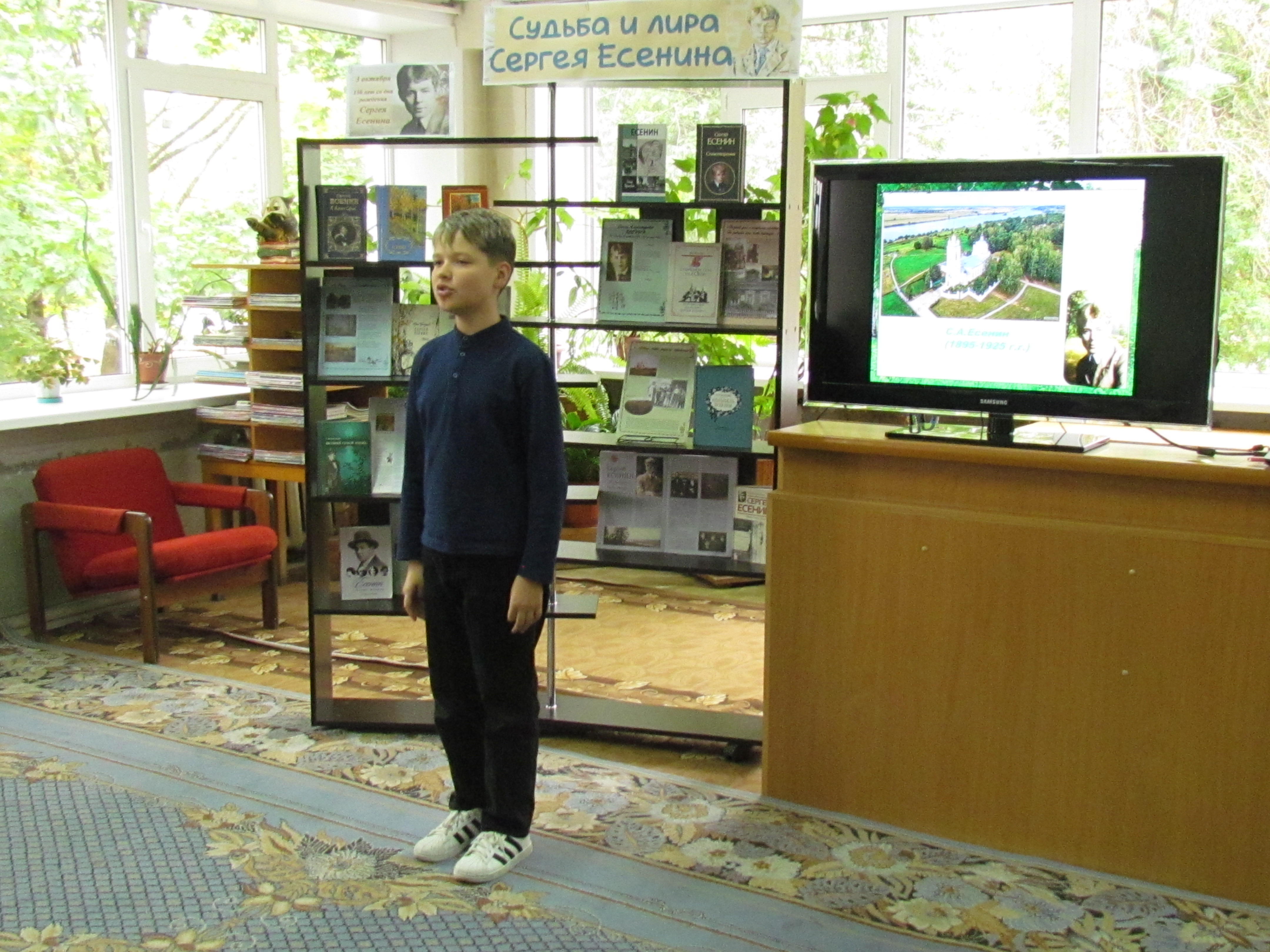 Библиотекарь рассказала о детских годах поэта, о первых шагах в литературе. Ребята совершили увлекательное путешествие по поэтическому лабиринту творчества замечательного поэта. Ученики читали знакомые стихи, слушали романсы и песни, написанные на произведения Сергея Есенина.