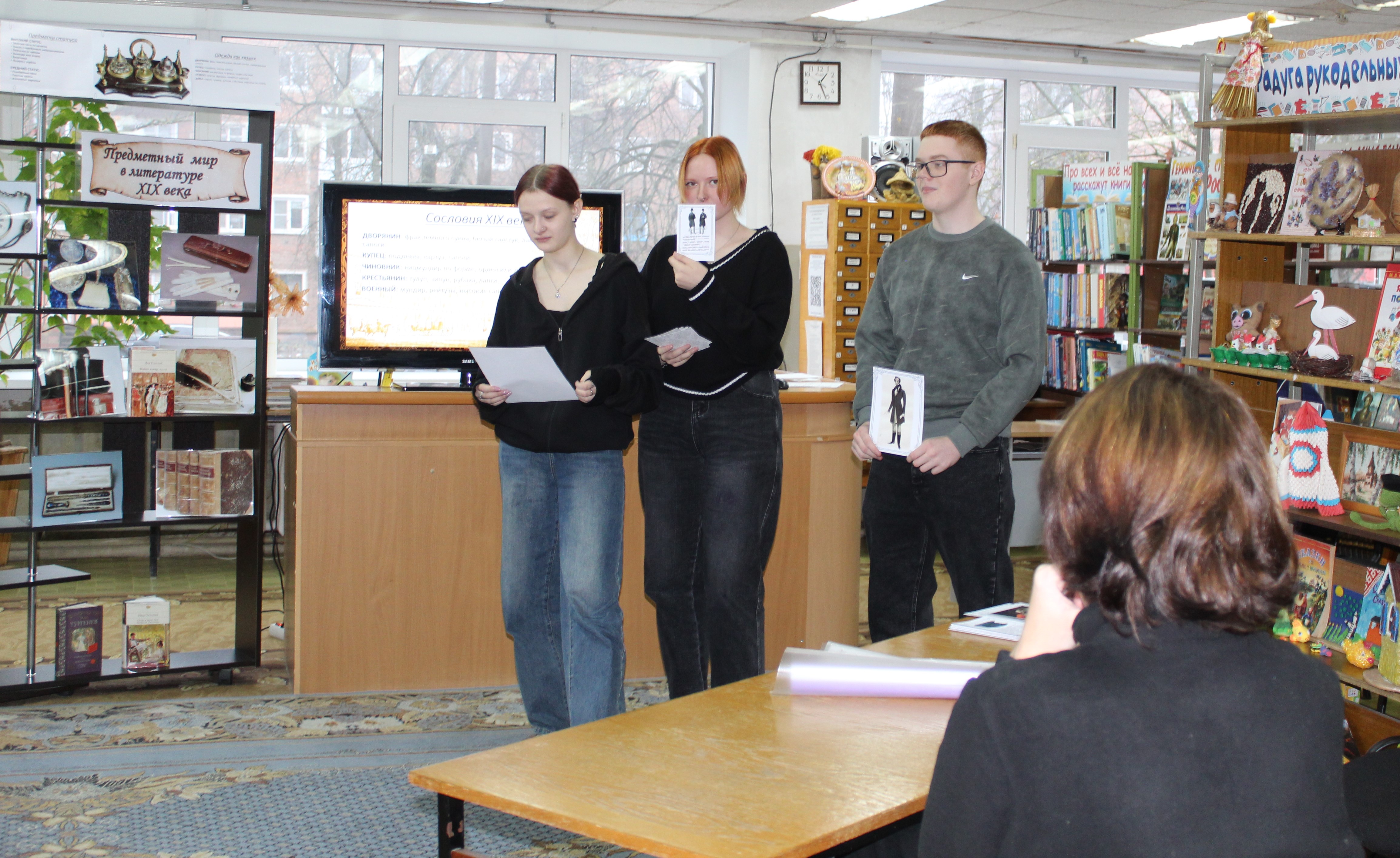Сафоновская модельная библиотека продолжает активную просветительскую работу по Пушкинской карте. Сегодня 27 ноября 2025 года студентам Сафоновского индустриально-технологического техникума сотрудники библиотеки представили литературный проект «Мир вещей в литературе: предметы героев XIX века». Частью проекта стал мастер-класс «Литературный гардероб». Ведущие мероприятия Алла Викторовна Селюкова и Татьяна Николаевна Новикова пригласили ребят в увлекательное путешествие по страницам русской классической литературы. Презентацию и видео-ролики представила Инна Григорьевна Богачёва. Участниками мастер-класса стали студенты 1 курса специальности электрики и наладчики и 3 курса специальности операторы производства. Ребята познакомились между собой, разделились на две команды и жеребьёвкой выбрали героя произведения, которого им предстоит сегодня представить.