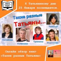 Отдел обслуживания Сафоновской центральной районной модельной библиотеки представляет онлайн-обзор книг «Такие разные Татьяны» к Татьяниному дню 25 января.