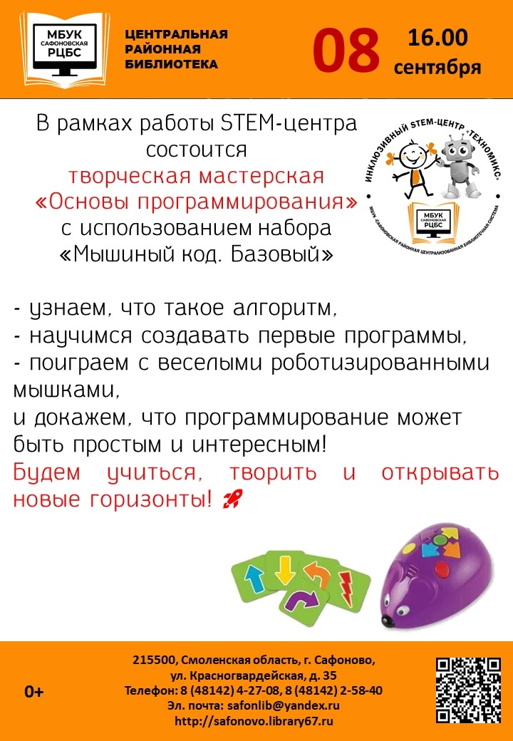 В Центральной районной библиотеке прошла творческая мастерская «Основы программирования с набором „Мышиный код. Базовый“» в рамках проекта "Инклюзивный STEM-центр «Техномикс»". Участникам рассказали про базовые элементы набора, показали, как работает программирование на простом и понятном языке.